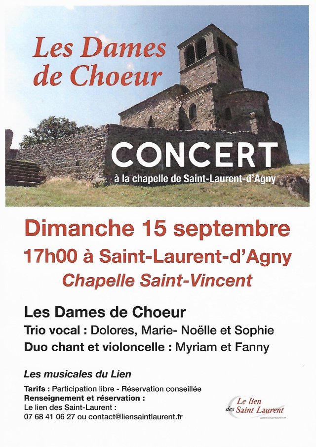 « Les Dames de Chœur » donneront un concert le dimanche 15 septembre prochain à 17 h, dans le cadre des « Musicales du Lien », à la chapelle Saint Vincent de Saint-Laurent-d’Agny.