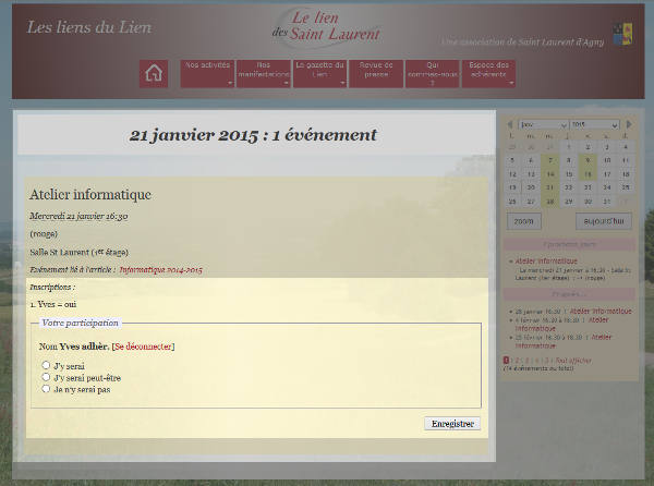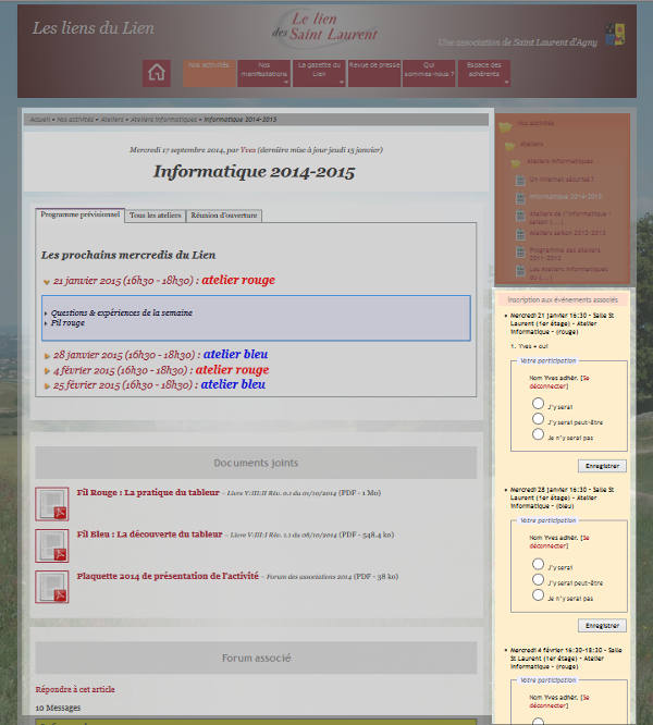 Seuls les événements non échus de l’article sont listés dans la colonne de droite de la “page article” avec, pour ceux qui proposent une liste d’inscriptions, la liste des réponses et le formulaire d’inscription.